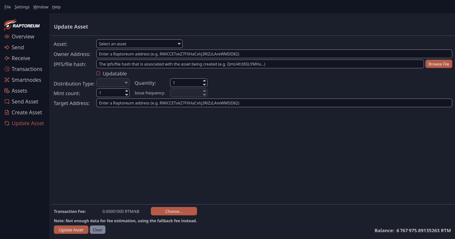 In this menu, you can send your assets, provided they are available in your wallet and you have some RTM (Real-Time Tokens) in your wallet as a fee.